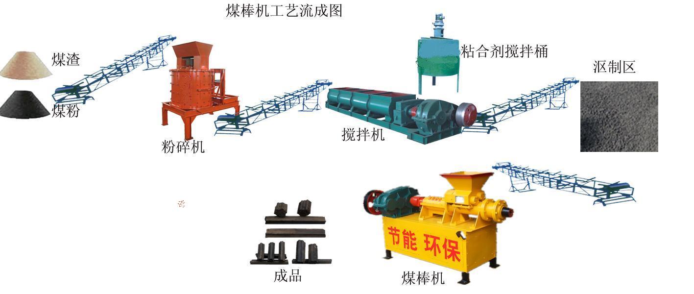 首先通過粉碎設備將原料進行粉碎,然后通過攪拌機把煤粉和粘合劑攪拌一下,選用制棒機通過高溫螺旋擠壓使這些原料粘合在一起。擠壓出來的煤棒就能使用了。